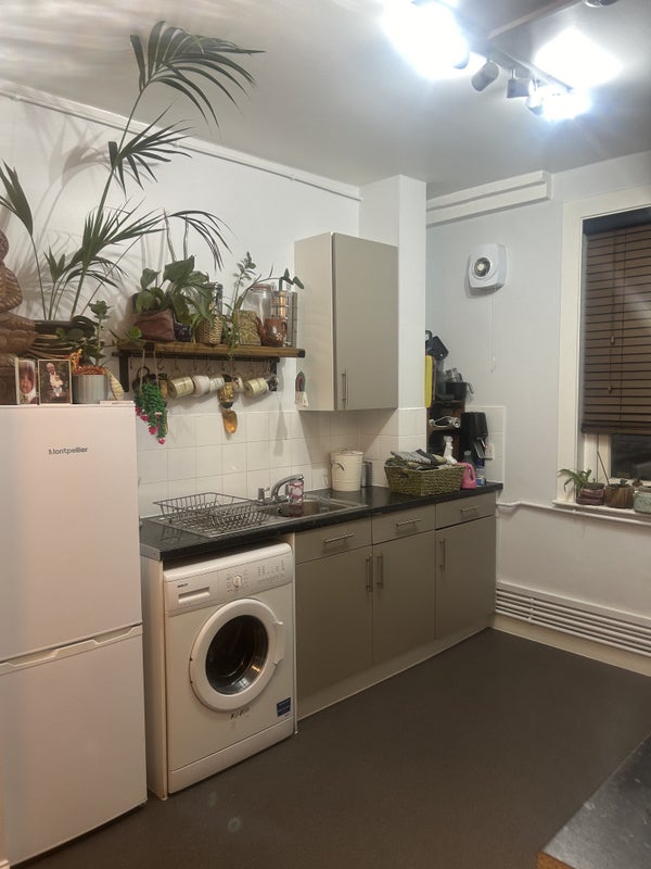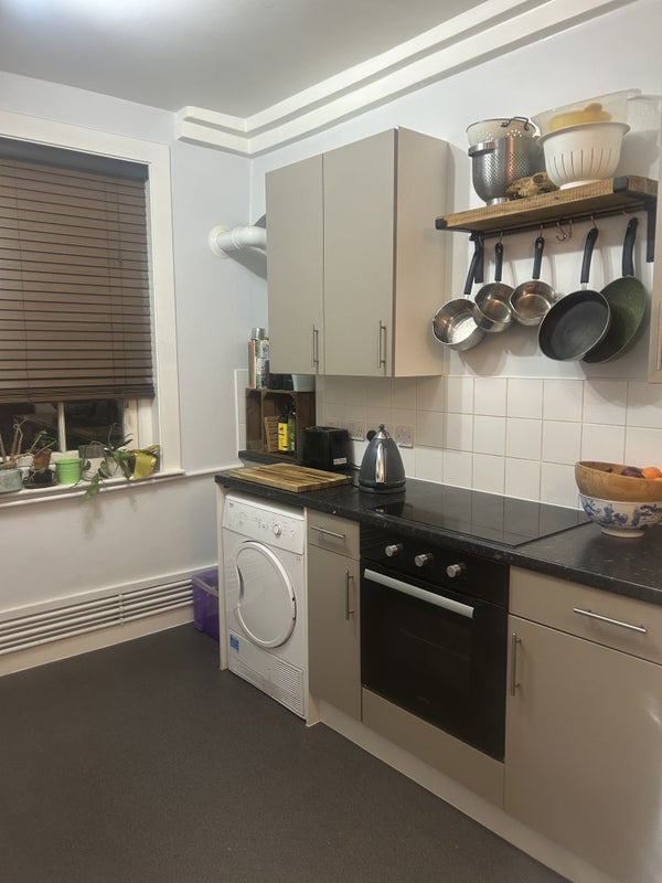 The bedroom is right next to the kitchen and another occupied bedroom. The kitchen is large and open plan and there is lots of light in the flat.