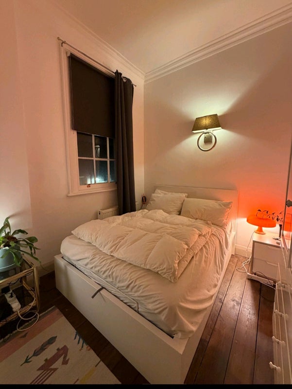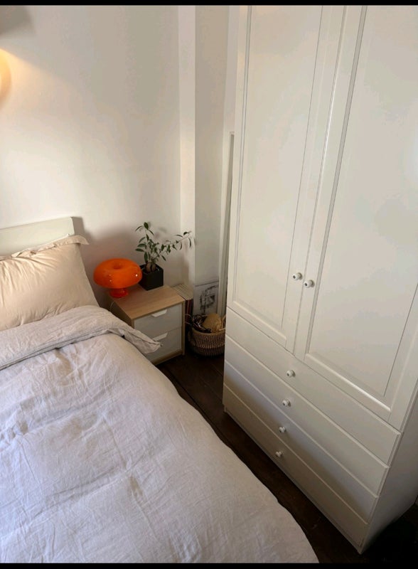 The room is rented with a bed and wardrobe included. The current photos still show the furnishings of the tenant who is leaving: almost all the furniture shown will be gone, except for the wardrobe. The bed will, however, be present.