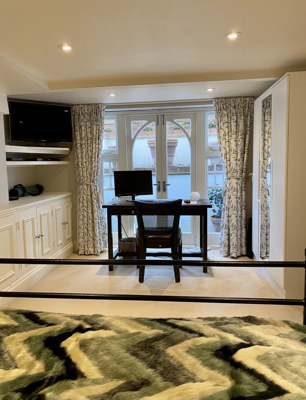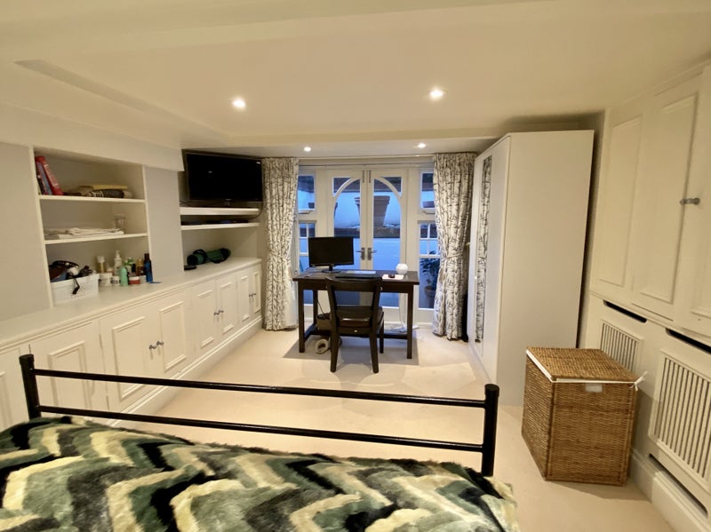 There is a designer wrought iron King Size double bed, a leather desk and chair and a wardrobe with a long mirror. Lots of storage space in the room. The bathroom with a shower is just outside.