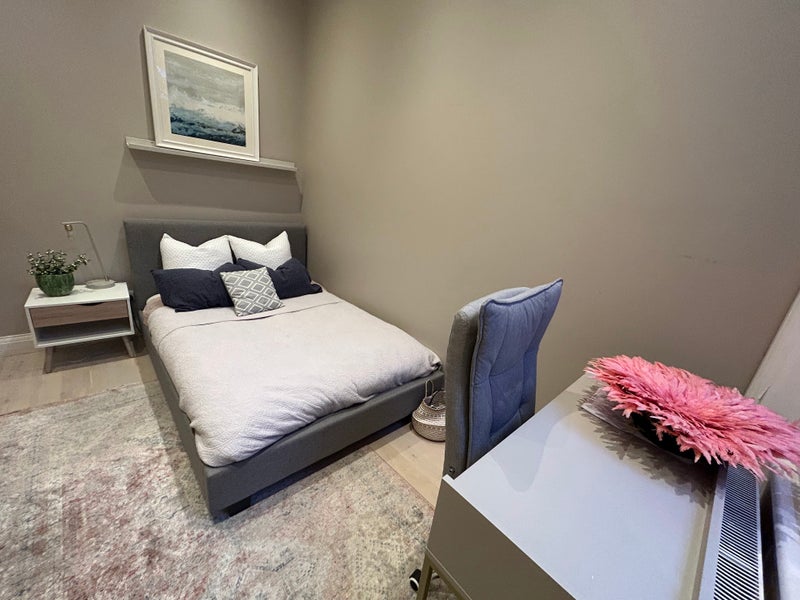 You'll have your own bathroom. The bedroom is really bright, with a desk, chair and lots of wardrobe space.