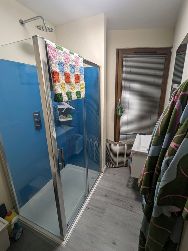 • Room: Spacious ensuite double bedroom with large waterfall shower and heated towel rail. Unfurnished but can sell you my double bed and mattress, shelves and clothes rail.