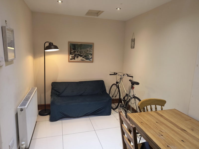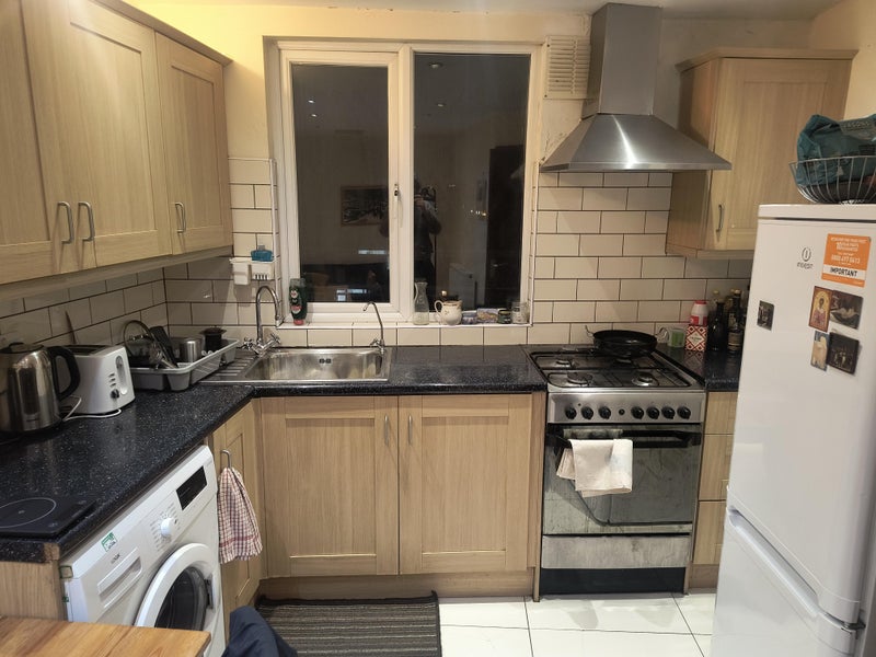 The room is a good-sized rectangular room. As you can see in the photo, it currently has a single bed, but it had a double before we moved in. It has a large window (you can get a lot of natural light) facing onto Rye Lane itself. The flat is decent living space, with a good kitchen for cooking (gas stove and enough work surfaces), a kitchen table, and seating area. With only two people, it’s uncongested. The bathroom has a bath/shower. There’s a staircase/hallway with enough space for two bikes.