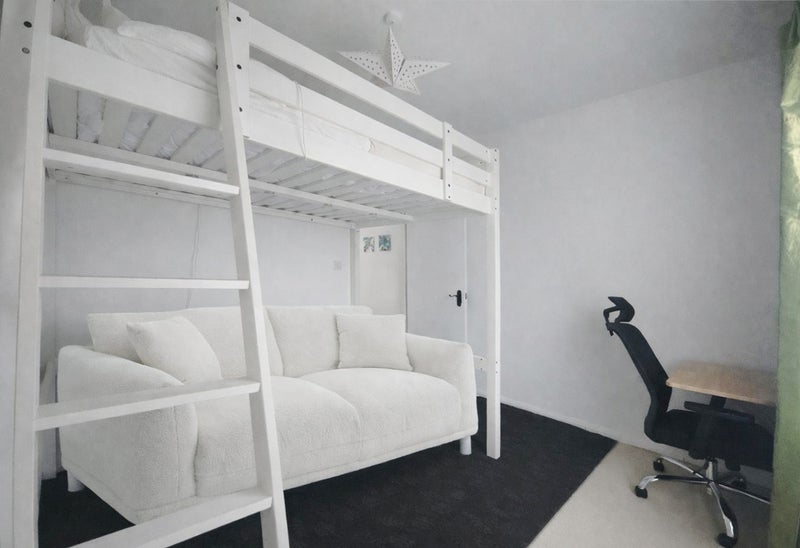 Furnished with a double loft bed with storage and a cosy sofa underneath.