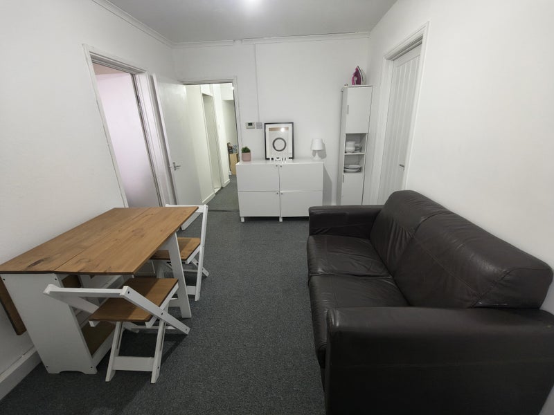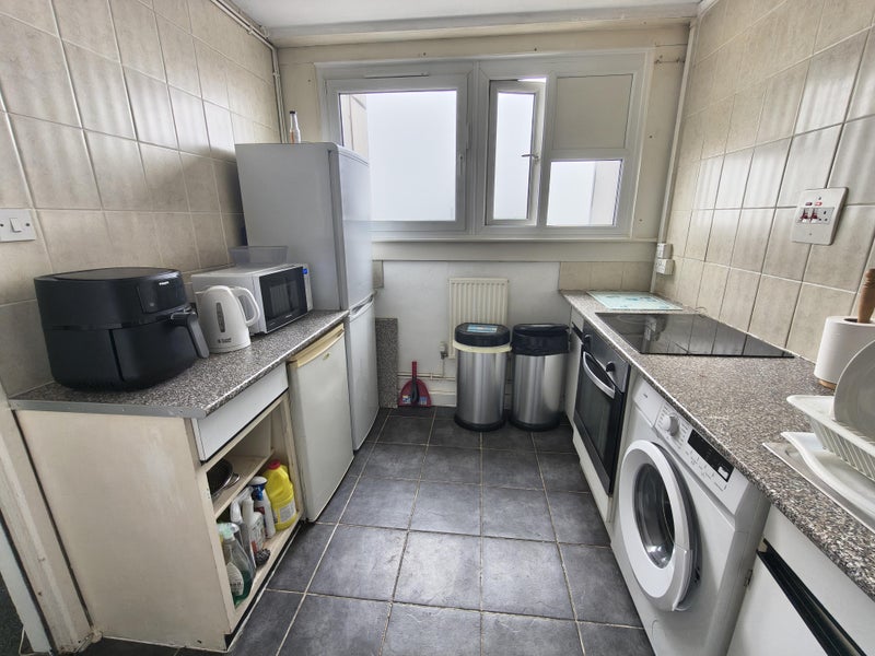 The flat has a shared living/dining room, kitchen, bathroom and toilet.