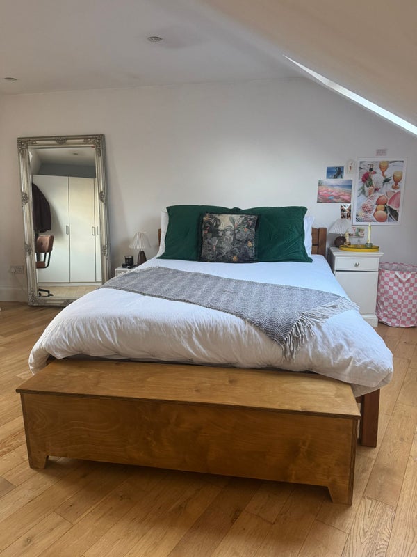 The room is a bright double with plenty of room on the top floor. It comes furnished with a double bed and wardrobe with hanging space and shelves.
