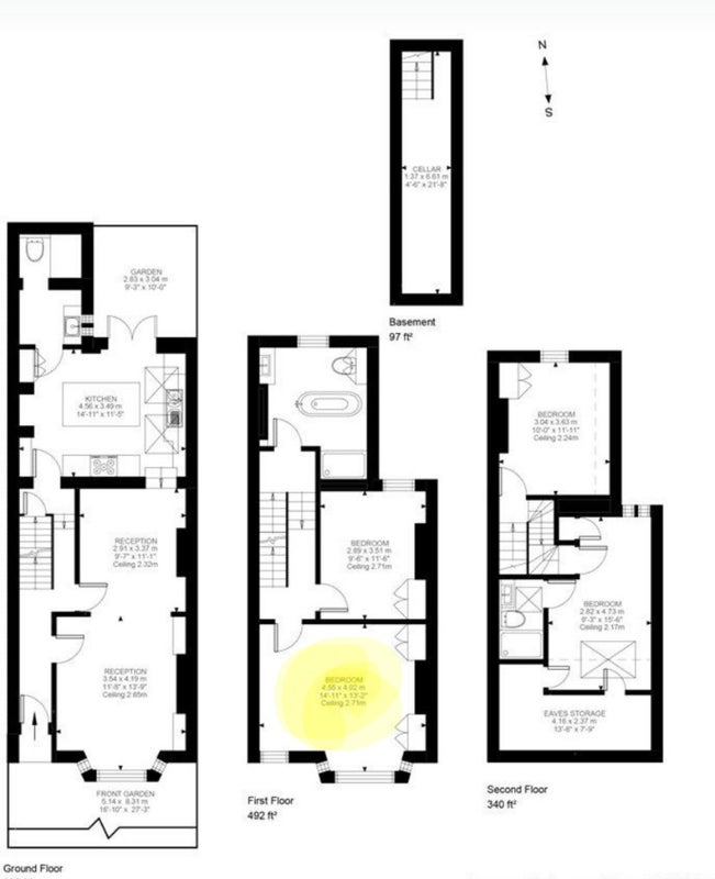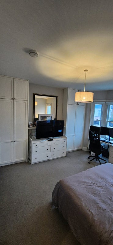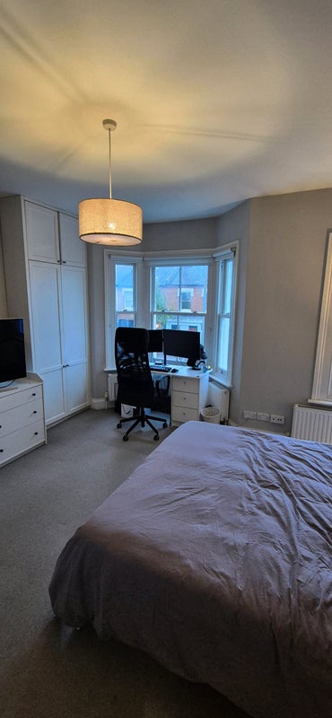 Bright and spacious double room on the first floor with two built-in double wardrobes, blackout blinds, and a lovely decorative fireplace. The big bay windows bring in loads of natural light during the day, and the room feels super cosy in the evenings. The house is fully furnished. The current tenant owns the bedroom furniture, but they’re happy to sell the bed and mattress should you be interested. Room is highlighted on the floor plan, largest room in the house.