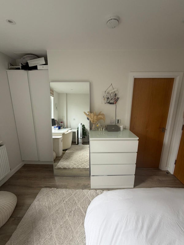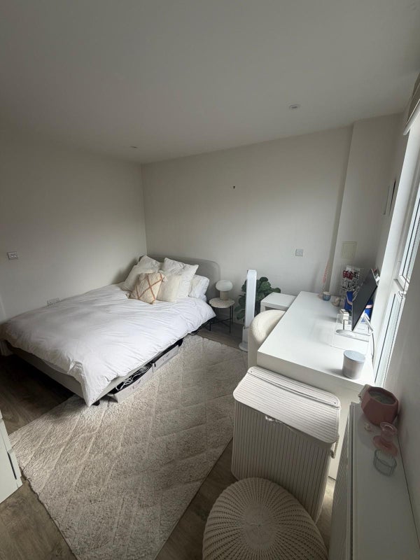 The room is a good size, currently easily houses a queen bed with space for a desk. Rent is £960 per calendar month and bills are around £130 per month, total ~£1090. Deposit £1000.