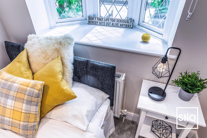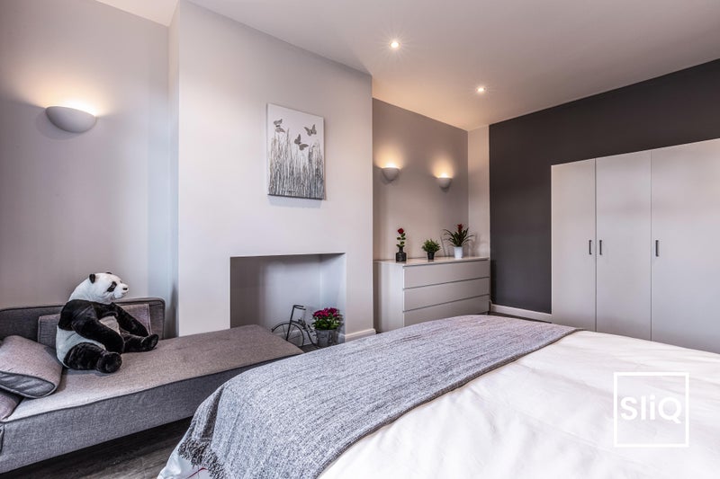 Modern and clean, this nicely sized double room features a unique bay window and checks all the boxes for comfortable living.