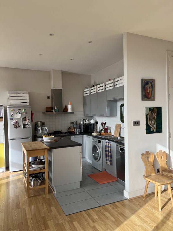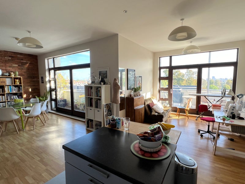The flat is large and airy, with plenty of natural light from floor-to-ceiling windows and two balconies with wide views across London. It offers a genuine sense of space, making it easy to relax and feel independent. Shared bathroom.