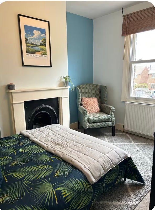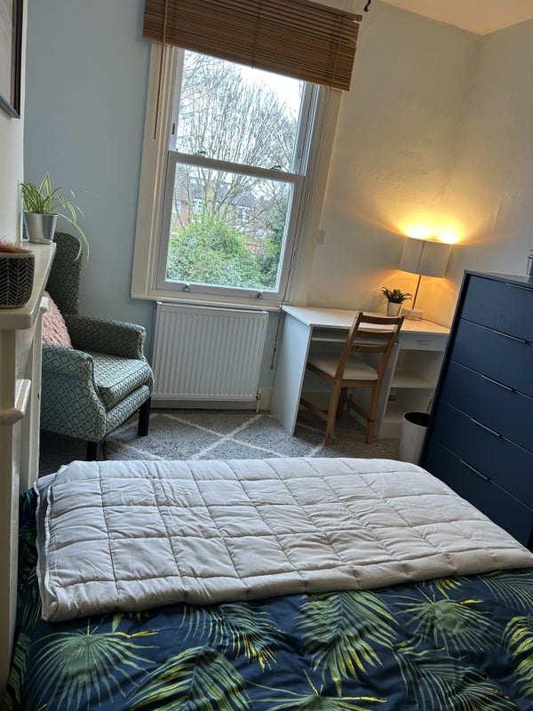 The room is furnished (double bed, clothing facilities, desk, arm chair), and overlooks the garden. We share the living room, kitchen, and bathroom.