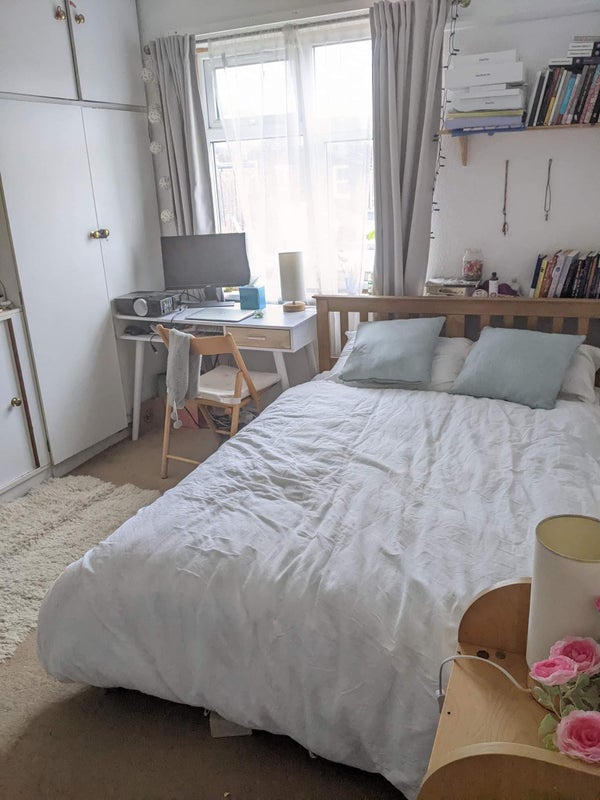 The room overlooks the back garden and gets the morning sun. It has built in (white yikes!) wardrobes and a double bed and would suit some-one who is kind, mindful and responsible, Is veggie (or happy to live in a veggie house) queer/ally who is happy to share caring for communal spaces.