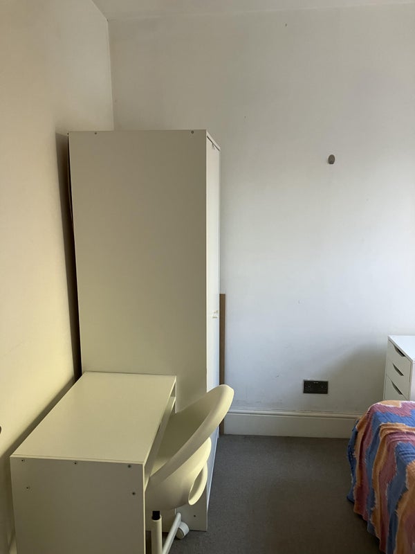 Room (pictures 2-4): rates £1050/month with broadband and weekly cleaning included, single bed, desk, wardrobe. The room is free from 30th November 2025.