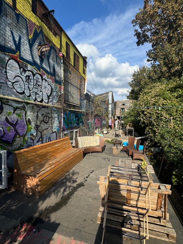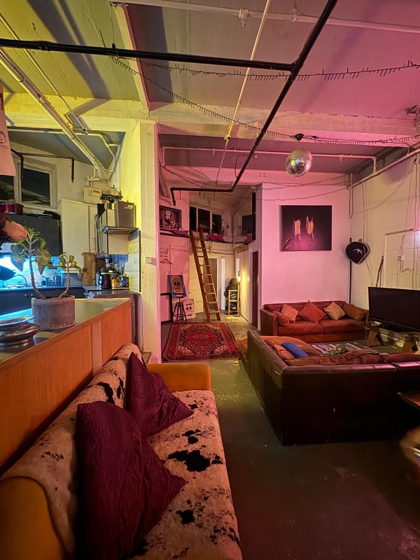 Big open plan communal space which has a fully equipped kitchen, living room and bathroom with a bath/shower. We also have access to the roof where we spend lots of time in the summer with our inflatable pool and bbq etc. We also have a communal mezzanine space for excess storage, and workshop space if needed.