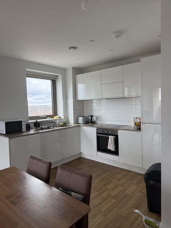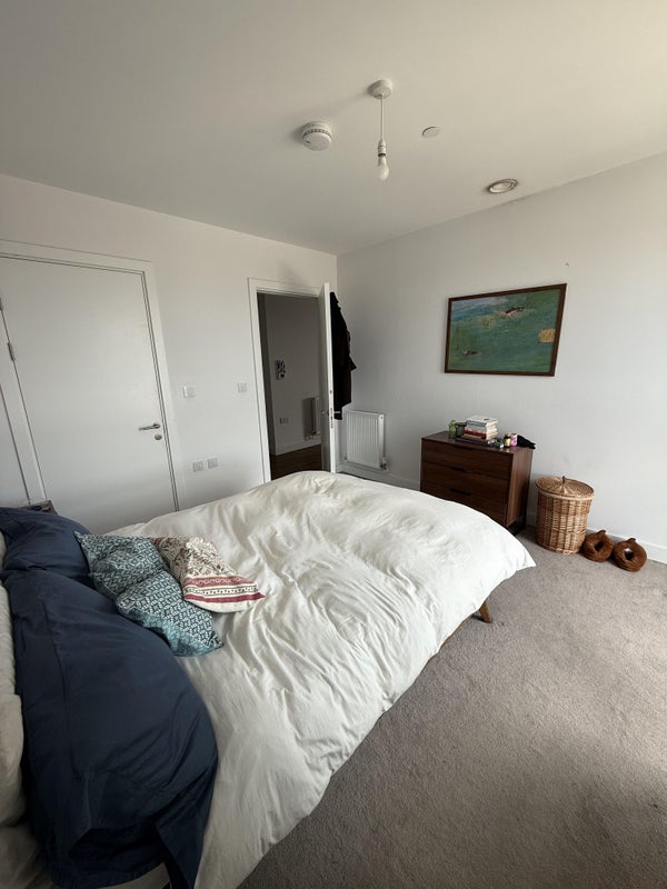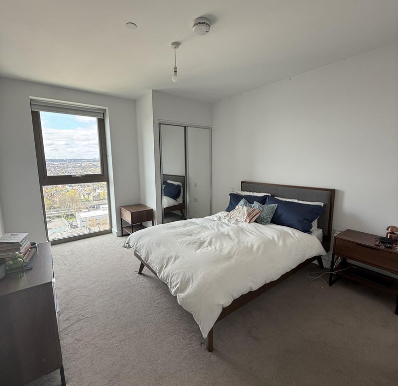 The bedroom is large and can fit a working station. It’s en-suite and has plenty of natural light. The balcony 8-meter long balcony with amazing lighting and views of the city and Canary Wharf. The building has a built in gym, 24 hour concierge, study room, common room and 2 big terrance gardens.