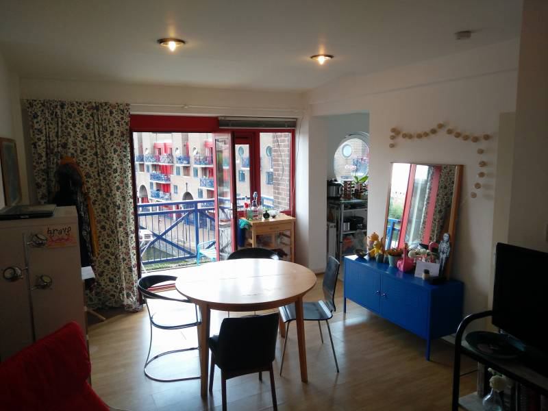 The flat overlooks Shadwell basin. The kitchen and living room are south-facing and bathed in light from big windows and balconies that open over the water. The kitchen and living room are a good size and are separate, but connected, rooms and there is a balcony off the living room. This makes the shared areas a pleasant set of spaces to hang out in, but means that it's not crowded if people are cooking in the kitchen, hanging around the dining table, sat on the balcony and chilling on the sofa watching TV.