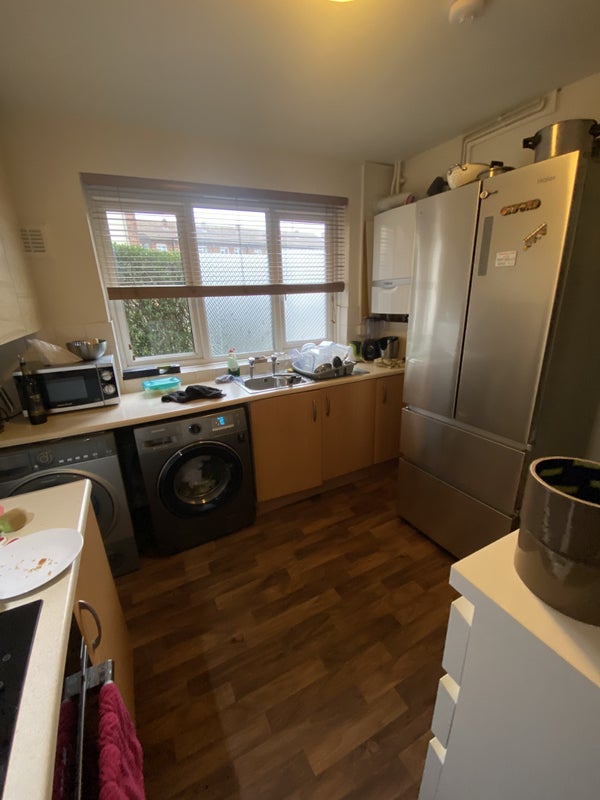 There is a large kitchen with washing machine, oven, fridge/freezer and a dryer!