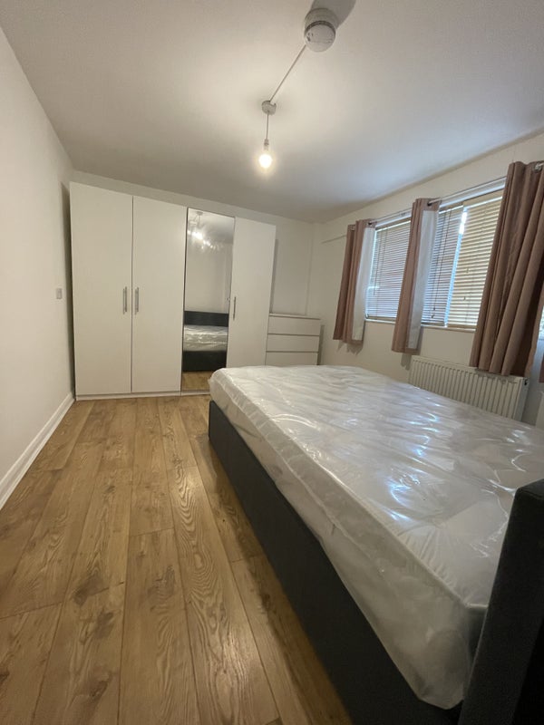 The room is bright, it has wooden flooring ; has a big double wardrobe, chest of drawers, a double bed and mattress. There is a window overlooking the garden.