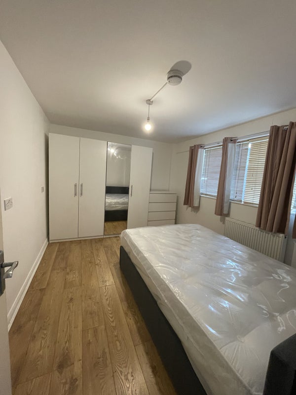 The room is bright, it has wooden flooring ; has two big double wardrobes, chest of drawers, a double bed and mattress. There is plenty of space for a desk.