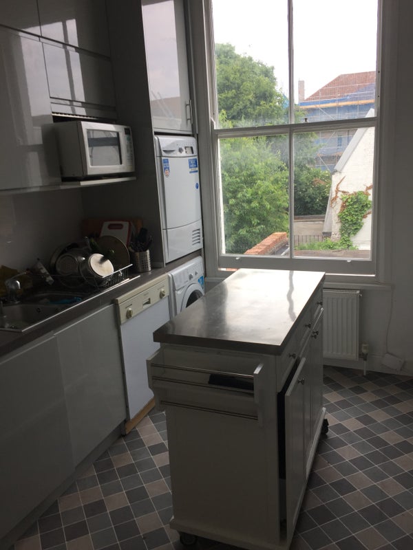 The flat itself: There are two showers and bathrooms which are on raised the first and second floors with high ceilings throughout. There is a communal kitchen / dining area, with outside terrace (lovely in summer).The kitchen has dishwasher, microwave, cooker, washing machine & separate dryer.
