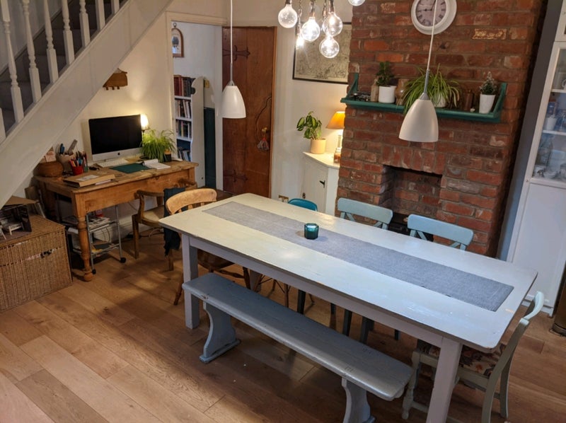Beautifully and fully furnished, in a quiet, leafy neighbourhood. The house has an open-plan living area, a separate sitting room with piano (great for WFH), a spacious kitchen with gas stove, and a dining table big enough for dinner parties. Outside: a private garden for relaxing and growing herbs/veg. Two bathrooms with two showers and a bath. Washing machine and dryer included. Spare guest bed in the living area downstairs.