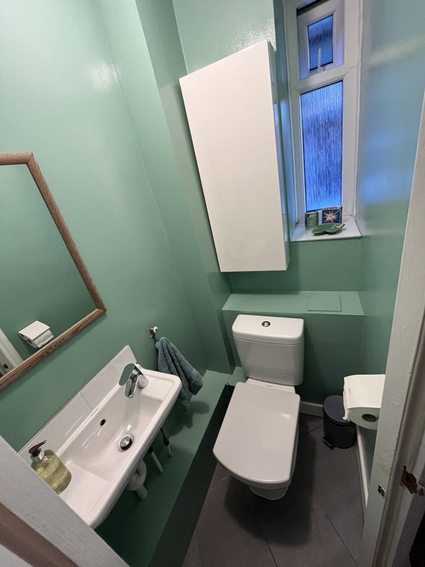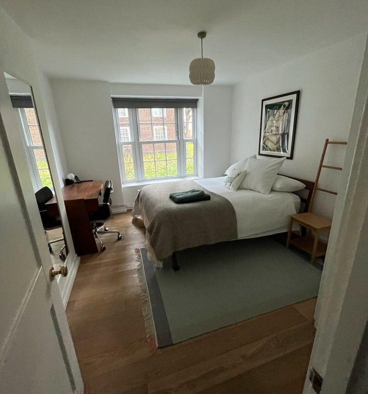 The master bedroom, which I have let to guests on occasion, is even bigger, with a standard double bed, large mid-century desk with large computer monitor for home working, and brand new ensuite bathroom (installed 2022). It is dual aspect (South / West) and looks out on the grass. I can let this along with the guest bedroom.