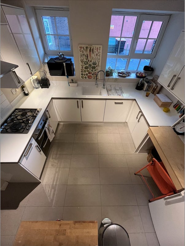 The kitchen and living room are colourful, spacious and well appointed. Use of: dishwasher, double oven with stove/hob, sodastream, various ways of making coffee, washing machine, ironing board, iron, heated clothes dryer, high-speed broadband, Alexa Echo, Hue lights, Hive thermostat.