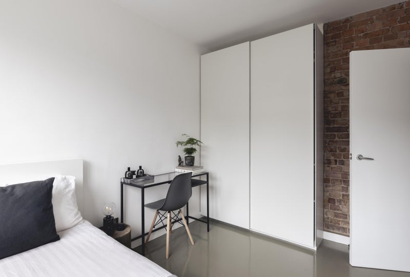 Better known as the Black Room - Good sized double bedroom with original exposed bricks and concrete floors Brand new double ottoman bed with ample storages underneath. The room benefits from big built in storage, a black modern desk, big black mirror, Eames chair and original artwork.