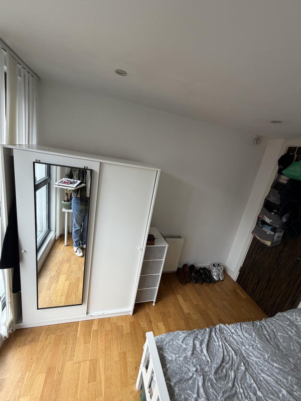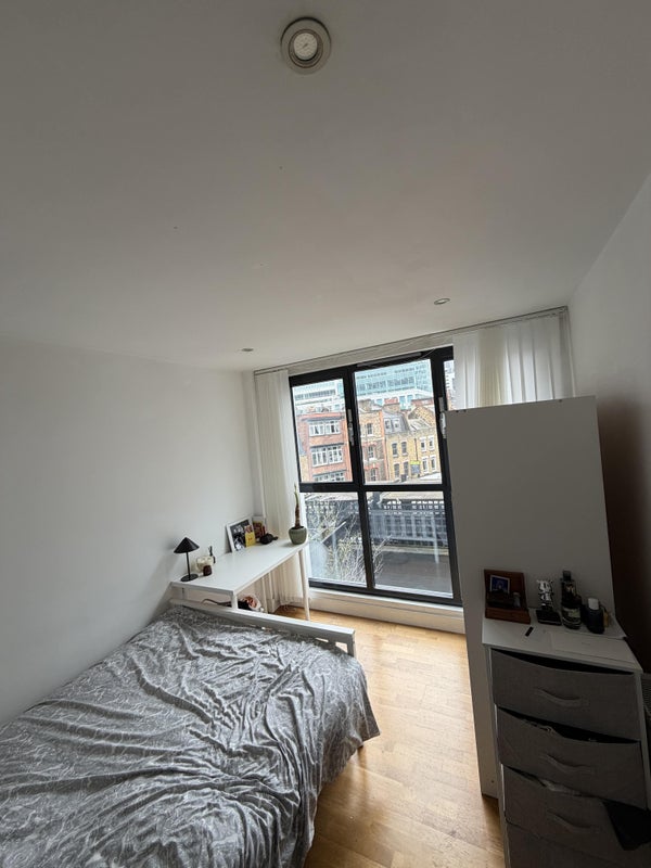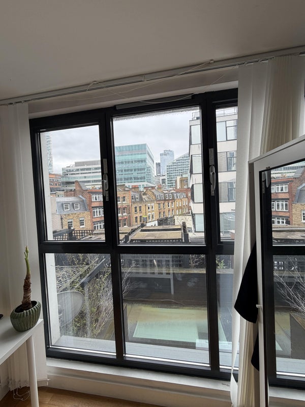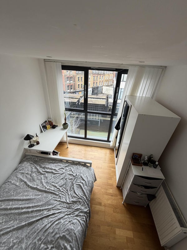 A great room available in a modern flat in the heart of Shoreditch, offering fantastic city views and a comfortable living space.