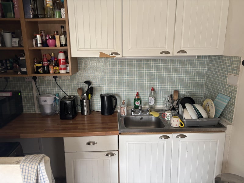 The flat has a big bright living room with small kitchen off it.