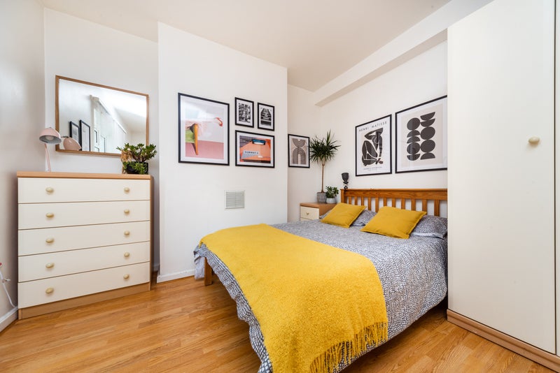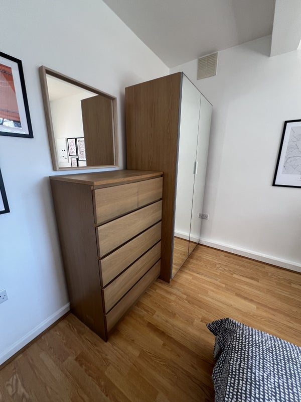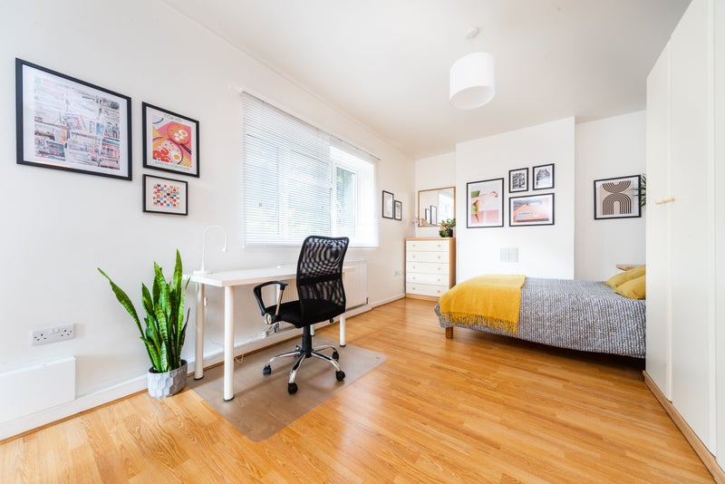 • Comes fully furnished with a double bed, desk (140cm), double wardrobe, and drawers