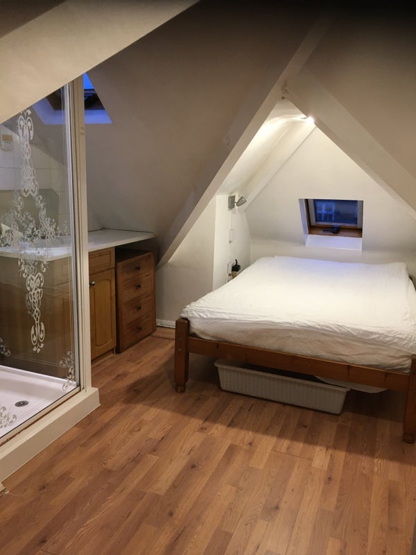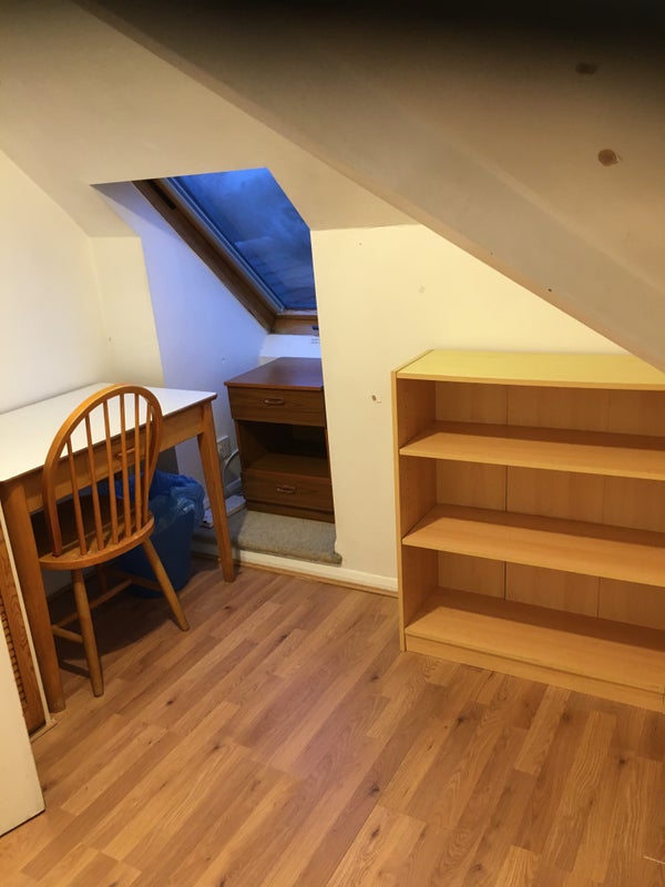 Single room with small double bed, desk, cupboard, basin & bookshelves. Own shower. Low ceilings as in loftroom, but 2 good under roof store cupboards.