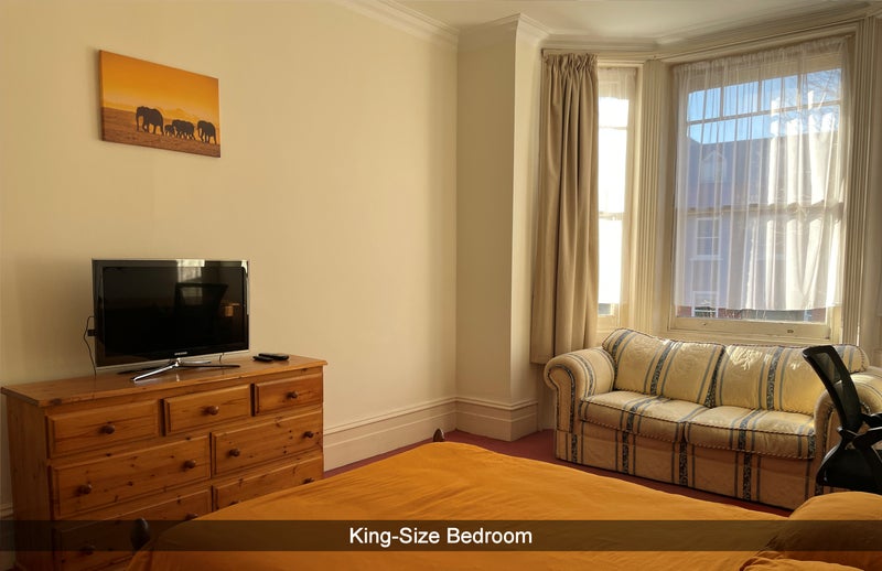 The room is a king-size bedroom in a spacious flat with high ceilings. The room comes furnished with a double bed, wardrobe, a large chest of drawers, desk and chair, and mini-sofa.