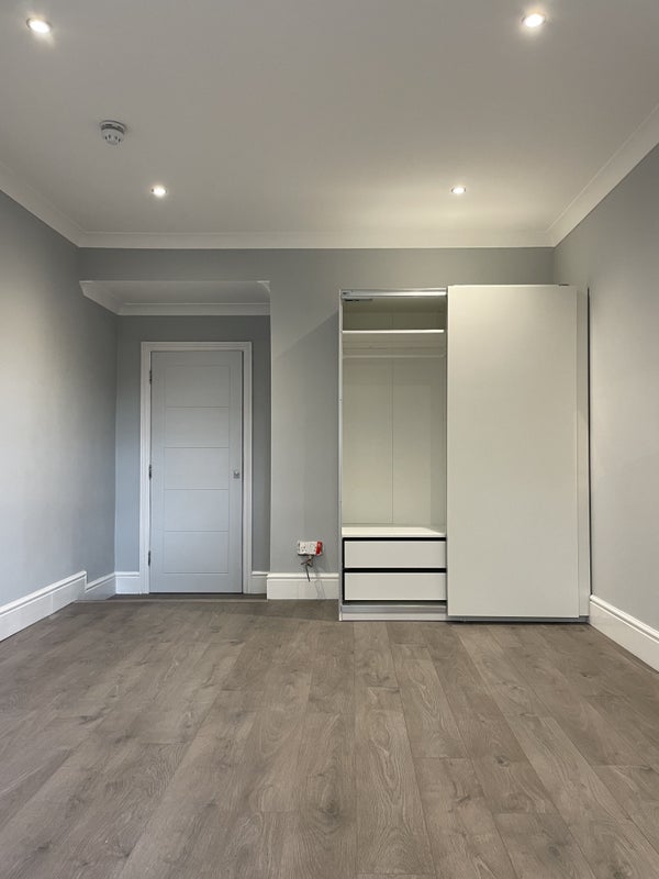 Triple sized bright and modern room with double aspect UPVC window & blind, down lights, large fitted Ikea wardrobe with sliding doors, grey flooring and optional new double bed.