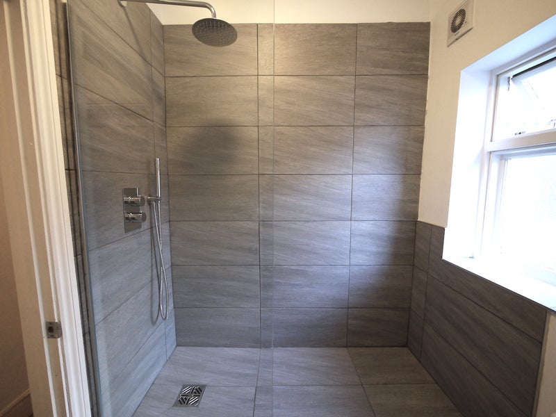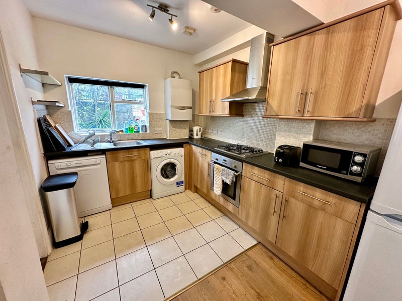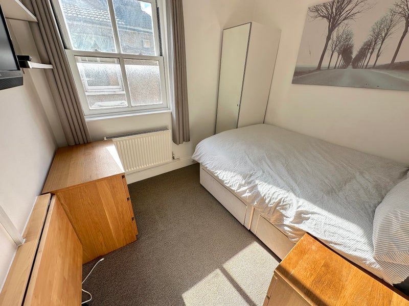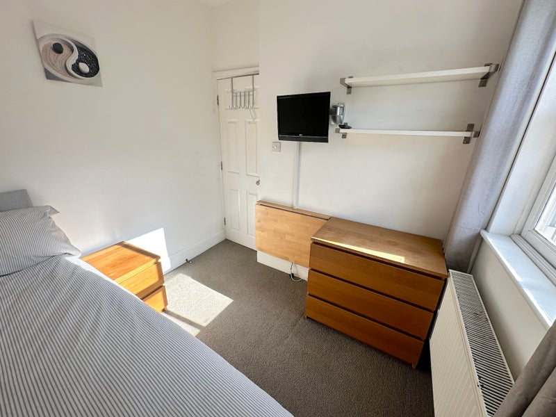 The room is compact in size, but set at the back of the house and very quiet. The room comes furnished to high standard and modern decor, containing double bed, full-length mirrored wardrobe, draws, bed-side table, fold-away desk and shelves. There is also a flat screen TV mounted to the wall. The room shares a bathroom (next door) with two other people.