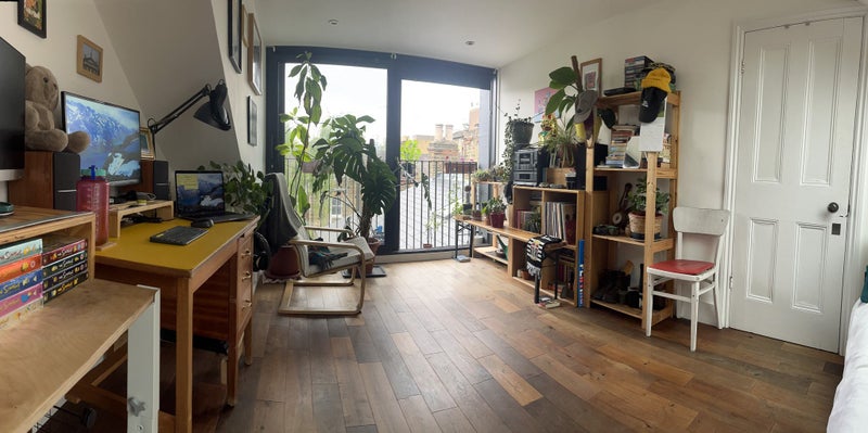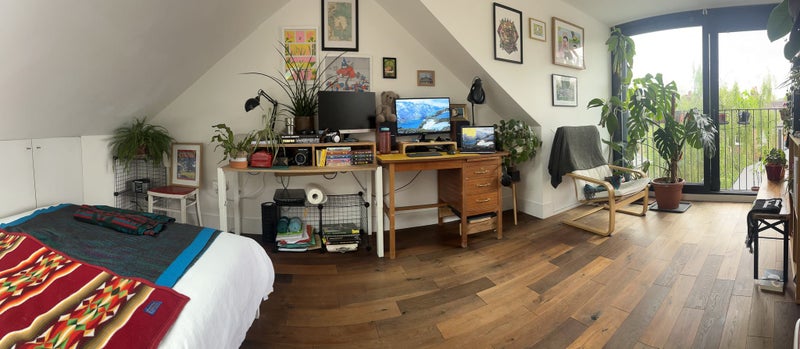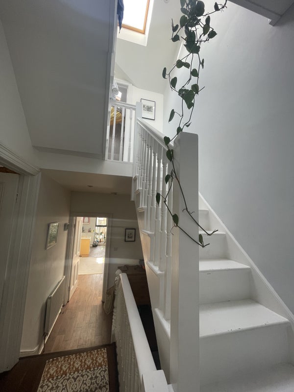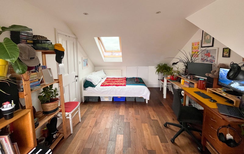 Self-contained studio vibes - bright high-spec loft conversion, with full-height sliding windows and Juliet balcony (south facing). It’s a good size, 15sqm floor area plus storage (peaks to a 7ft ceiling height so may not be suitable for someone over 6ft). You’re own compact but full-spec bathroom on the landing.