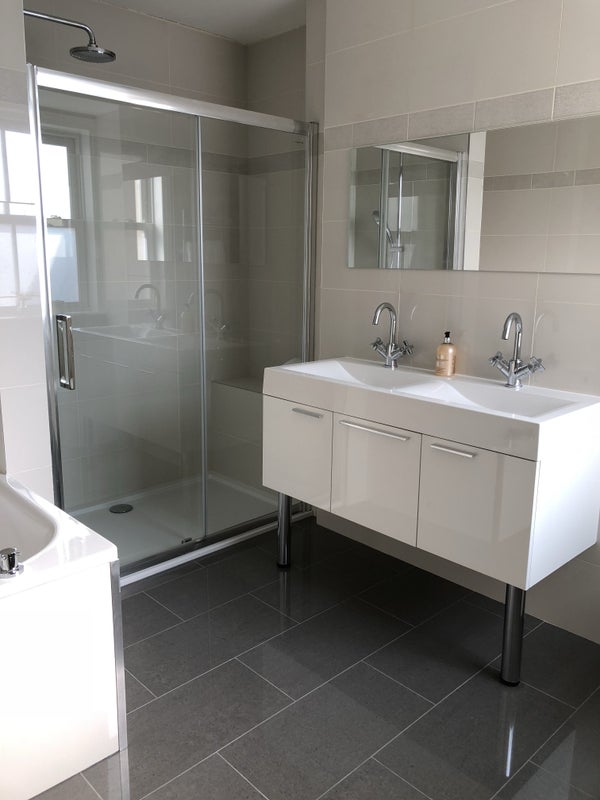 The bathroom is lovely and has a bath as well as a large power shower and double sink .