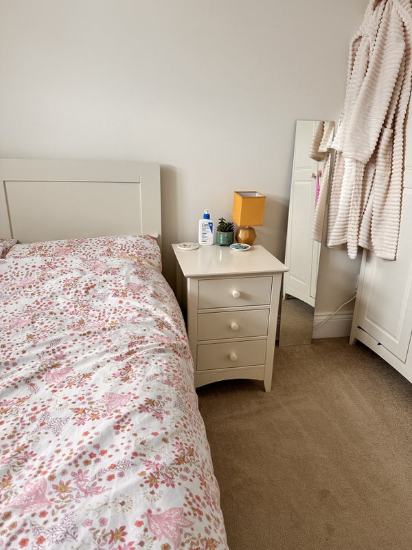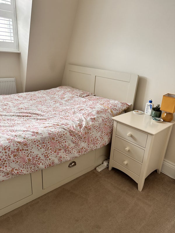 The room has a double bed with under bed storage , a wardrobe and a chest of draws