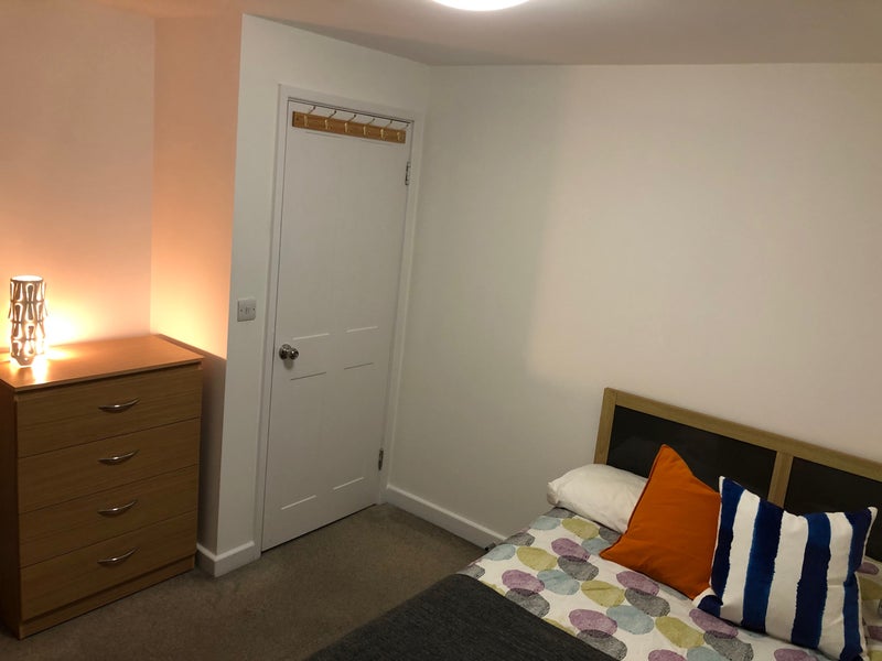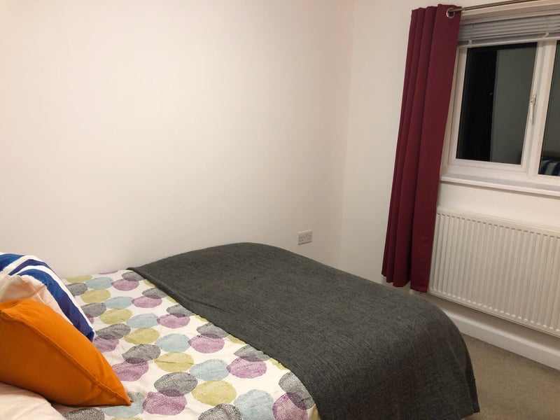 The double room is fully furnished with bed, wardrobe, chest of drawers, and black out curtains. Beautiful bathroom with toilet, sink and bath- shower.