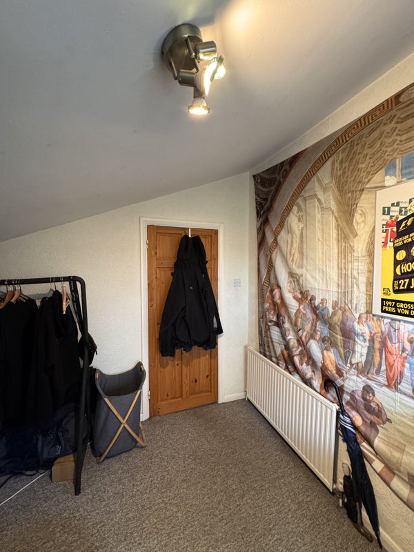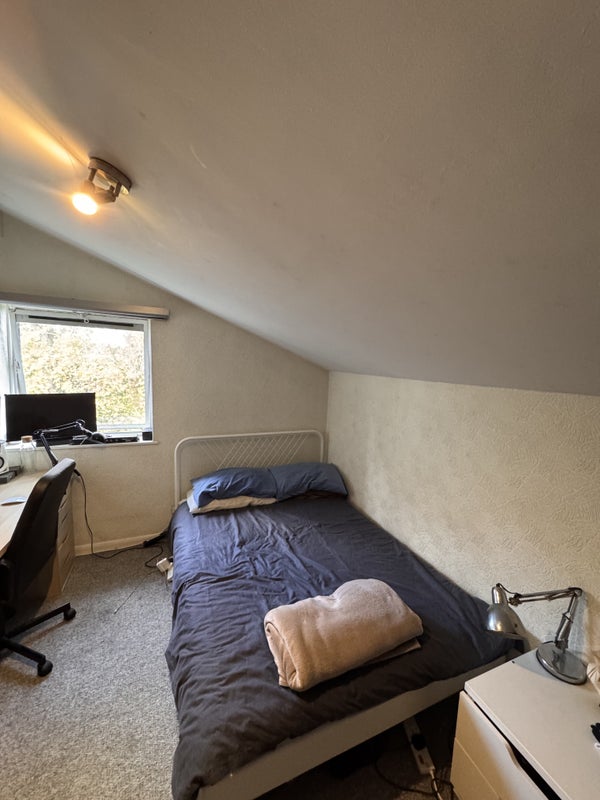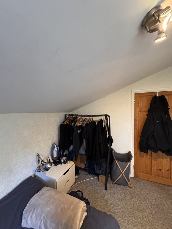 Room is furnished with a Bed and Matress, Desk, Chair, Draws and Clothing Rack. The room also comes with extra storage space outside the room, large clohting draws.