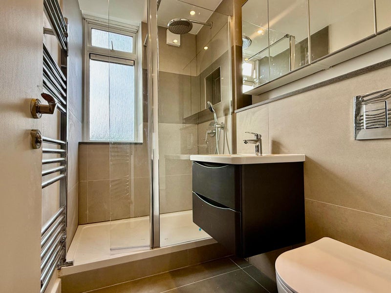 The apartment further benefits from a modern tiled shower room with rainfall shower, as well as a separate WC, providing added convenience for sharers or guests.