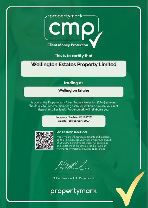 Our agency are members of Property Mark, Client Money Protection and we hold an account with the Deposit Protection Scheme (ID number 1 8 7 0 9 7 4). Our trading name & registered office address is Wellington Estates Property Ltd, WorkLife, 1 7 4 Hammersmith Rd, London, W6 7JP company registration number 0 9 7 7 8 0 1 9 7. We charge no administration fees to tenants.