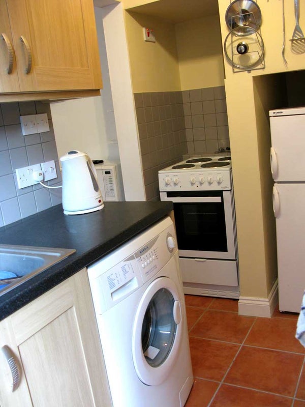 The compact kitchen has a gas fired boiler, washing machine, fridge freezer and various standard cupboard units.