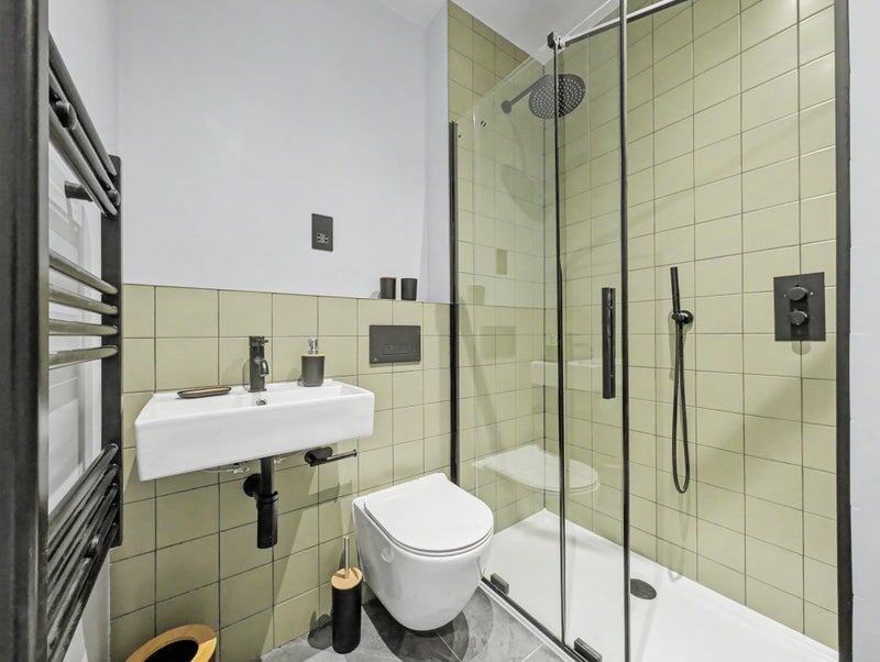 The kitchen is fully fitted with high-spec modern units, integrated electric appliances, and includes a washing machine. The bathroom is spacious and finished to a sleek, modern standard with high-quality fittings.
