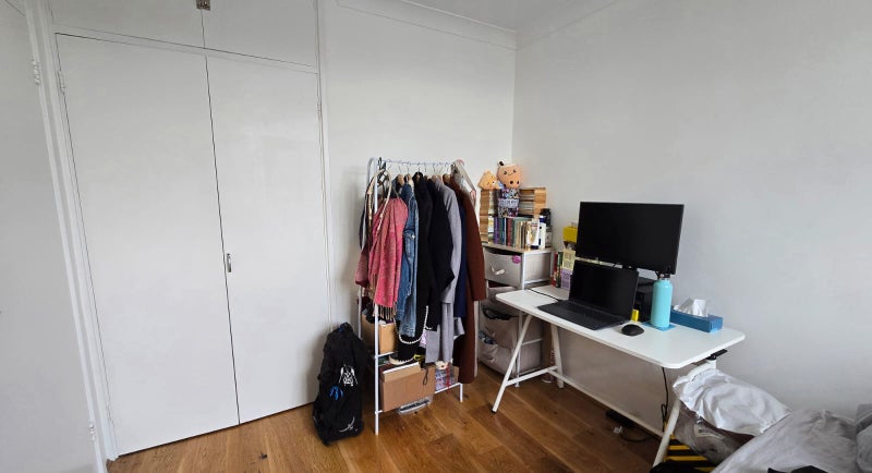 The room comes partly furnished with a bed, side drawer, and inbuilt wardrobe.
