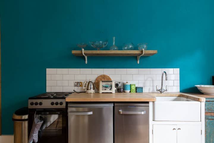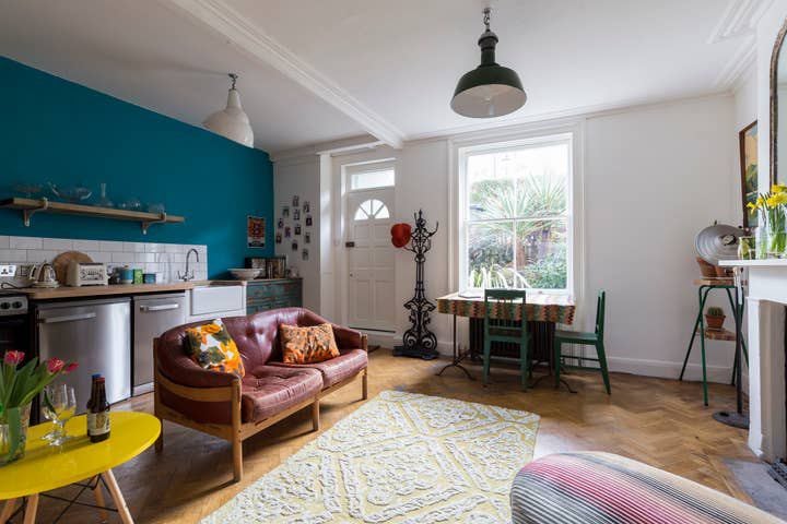 It is fully furnished with eclectic furniture, the kitchen is fully equipped. The bathroom features a roll top bath and the bedroom features a king sized bed. The apartment has its own front door, down a short set of steps.