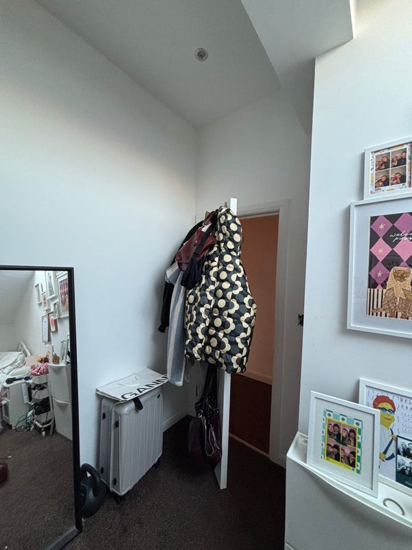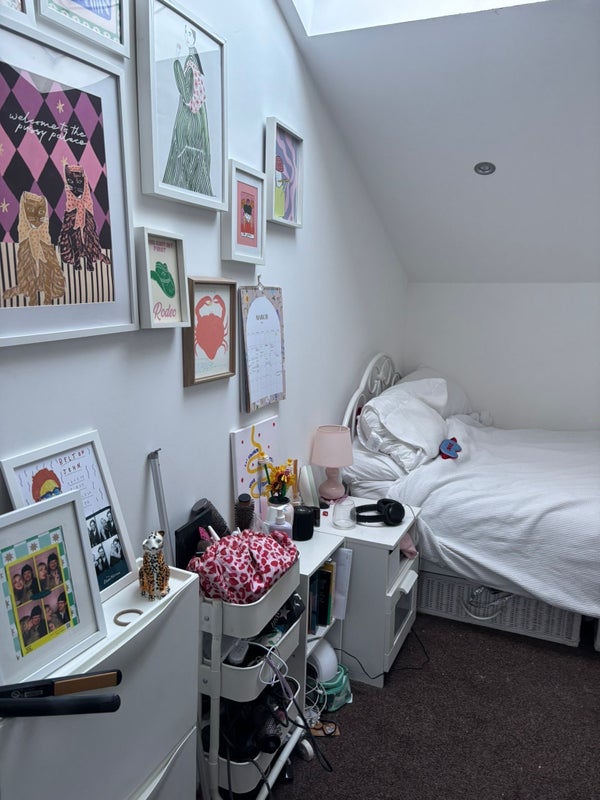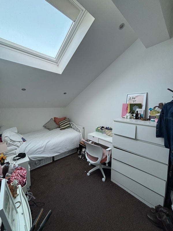 The room itself is tucked under a skylight so you get gorgeous daylight (and the occasional dramatic rain moment), with plenty of space for a double bed, desk set-up, and storage. It’s technically unfurnished, but my current flatmate is happy to sell on some bits if that’s helpful — so you won’t be starting from scratch.