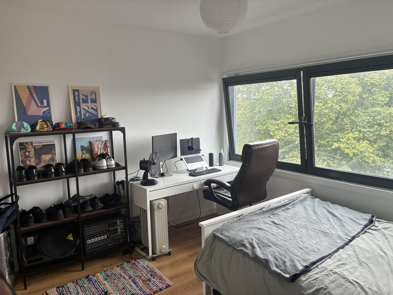 A good-sized, bright double bedroom with built-in wardrobe storage. The room comes fully furnished with: