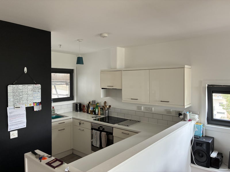 The living area is fully furnished with contemporary fittings and makes a great space to relax, cook, or work from home. There is a shared bathroom with bath and shower, kept clean and tidy.