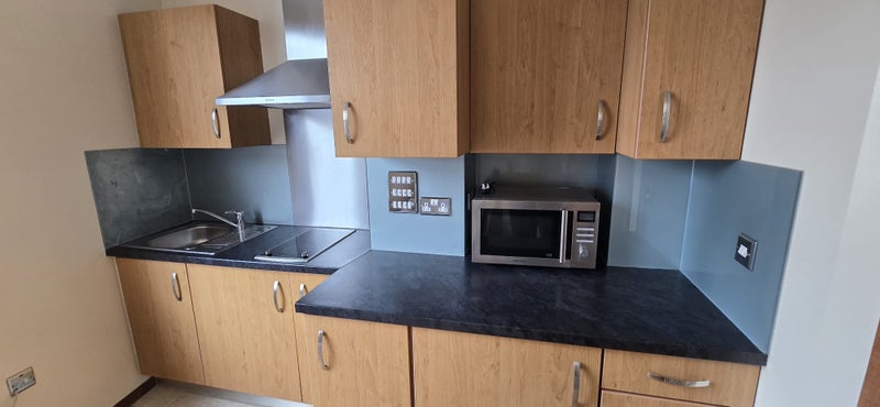 The studio features a fully fitted kitchenette with storage units, sink, cooking hob and microwave, along with a spacious living/bedroom area with natural light from a large window. The property also benefits from a modern en-suite bathroom with shower, WC and sink.