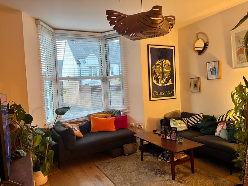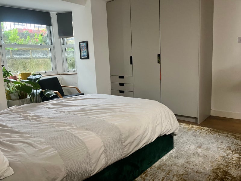 The flat is beautiful, with a great flow, full of art and good vibes. Your room is a spacious double with a bay window and built-in wardrobe and an en-suite bathroom with bath/shower. (Otherwise unfurnished)